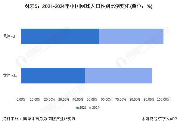 从中国网球人口性别比例变化来看,2021-2024年女性网球人口数量比重由45%增长至47%,男性网球人口数量比重由55%降至53%。