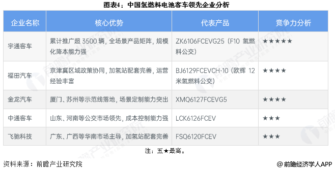 目前来看,中国氢燃料电池客车市场领先企业主要为宇通客车、福田汽车、金龙汽车、中通客车、飞驰科技等,其中,宇通客车氢能源客车累计销量超过3500辆,领先较为明显。
