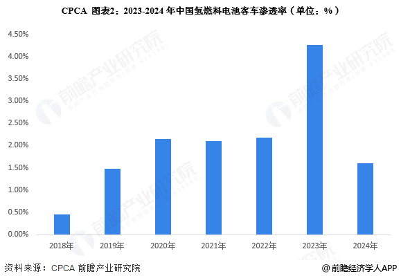 根据乘用车市场信息联席会CPCA数据,目前中国氢燃料电池客车整体渗透率极低,2024年仅1.61%,较2023年有所下滑。