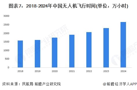 2018-2024年,随着民用无人机应用领域的不断扩大,中国无人机累计飞行时间逐年增长,2024年中国无人机累计飞行时间为2666.7万小时。