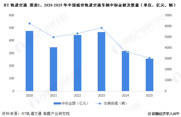 城市轨道交通设备是城市轨道交通产业链中游环节的重要组成部分,其中车辆是最主要的城轨设备,当前主要通过招投标市场来完成采购。据RT轨道交通统计的数据来看,2023-2025年中国城市轨道车辆需求有所减少,2025年全国招标车辆数共计3076辆,同比下降16%;中标金额同比下滑19.5%,为256.41亿元。