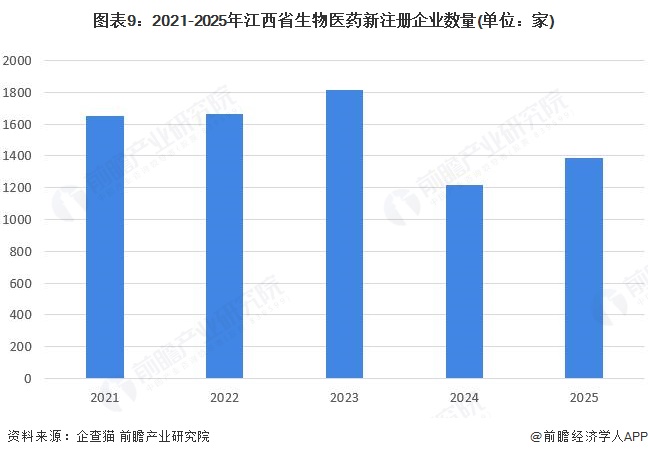 江西省医药产业发展基础良好,截至2026年1月,江西省生物医药企业上万家,拥有济民可信集团,仁和集团,青峰医药集团,汇仁药业,华润江中,博雅生物,洪达医疗,天新药业等一批龙头企业。近年来,江西省医药行业发展进入成熟阶段,新注册呈现下降趋势,2025年江西省生物医药新注册企业数量约为1388家。
