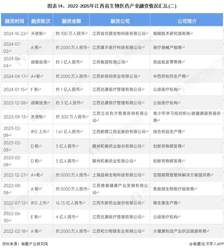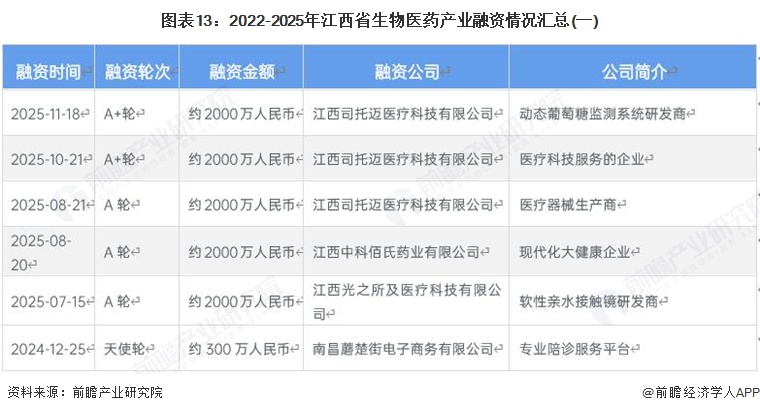 从生物医药产业融资情况来看,2022-2025年,江西省生物医药产业融资十分活跃。从融资轮次分布情况来看,A轮到D轮及IPO等中后期轮次均有,融资领域集中于创新药物研发与高值医疗器械,整体来看,江西省生物医药产业具有良好的融资环境。