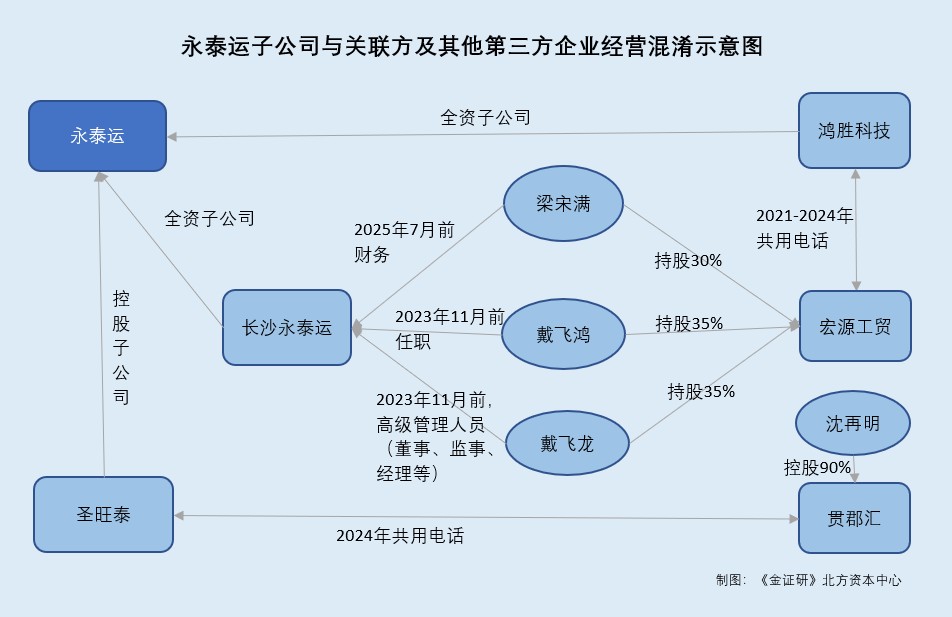 除此之外,截至2025年7月,永泰运子公司长沙永泰运的财务负责人为梁宋满,且戴飞鸿、戴飞龙系长沙永泰运原高级管理人员。而2021-2024年,“梁宋满”、“戴飞鸿”、“戴飞龙”控制的企业与永泰运子公司鸿胜科技共用企业联系电话,或上演经营混淆异象。