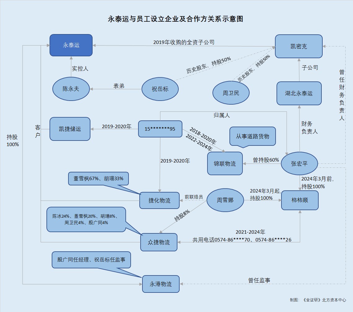 需指出的是,湖北永泰运系凯密克2024年成立的子公司,张宏平系其财务负责人。截至2025年12月,同名“张宏平”控制的锦联物流的经营范围包括道路货物运输业务。另外,永泰运申报创业板期间的客户凯捷储运、捷化物流,在2019-2020年期间曾与锦联物流共用企业联系电话,且该电话的实名用户或为张宏平。