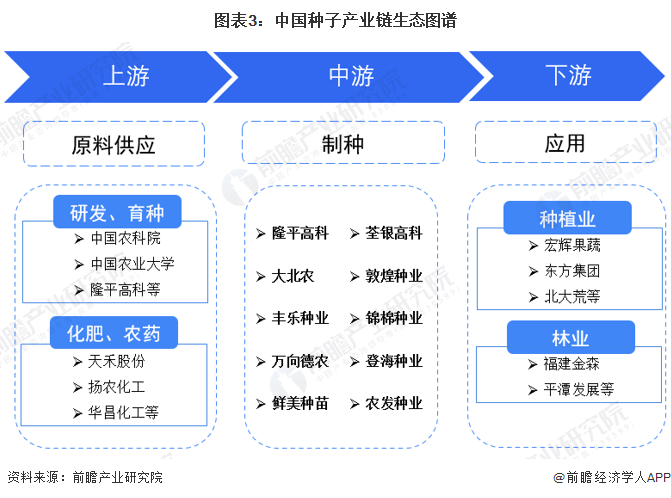 种子行业上游种子研发机构包括中国农业大学、中国农业科学院、隆平高科等;中游种子生产企业主要包括隆平高科、登海种业、丰乐种业、万向德农、荃银高科等;下游种植业企业主要包括东方集团、宏辉果蔬等,林业企业包括福建金森、平潭发展等。