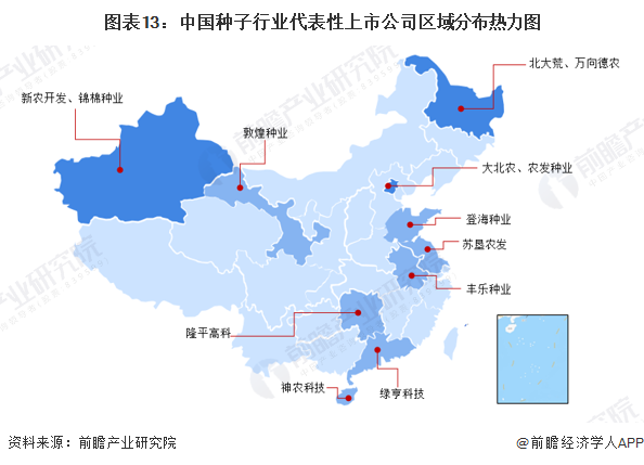 从区域分布看,中国种子研发和生产企业主要分布在新疆、黑龙江、北京等省市,其中新疆代表性企业包括新农开发、锦棉种业,黑龙江代表性企业包括北大荒、万向德农,北京代表性企业包括大北农、农发种业。
