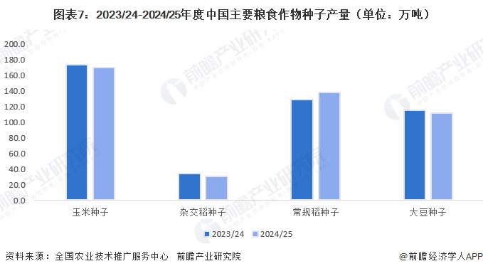 2024/25年度,玉米种子、杂交稻种子、常规稻种子和大豆种子产量分别达到170万吨、31万吨、138万吨、112万吨。其中,常规稻种子产量上升,其他三种作物种子产量下降。