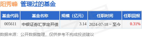 阳秀峰女士:中国国籍。硕士。2010年7月至2015年4月任职于天津农村商业银行股份有限公司,历任交易员、投资经理;2015年5月至2015年12月任职于中融国际信托有限公司,担任投资主管;2016年1月至2019年3月任职于中融汇今资产管理有限公司,担任投资经理;2019年6月加入中银国际证券股份有限公司,曾任资产管理部投资顾问、投资经理,现任职于基金管理部。现任中银证券汇享定期开放债券型发起式证券投资基金基金经理。
