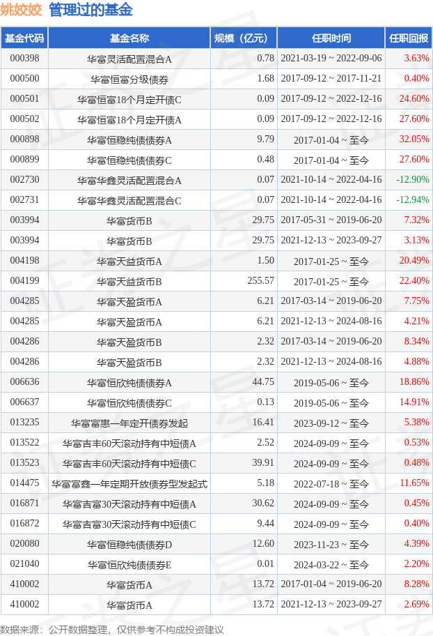 姚姣姣女士:中国国籍,复旦大学金融学研究生学历、硕士学位。历任广发银行股份有限公司交易员、上海农商银行股份有限公司交易员。2016年11月加入华富基金管理有限公司,现任华富天益货币市场基金基金经理、华富恒稳纯债债券型基金基金经理、华富恒富18个月定期开放债券型证券投资基金基金经理。自2019年5月6日起任华富恒欣纯债债券型证券投资基金基金经理。2021年3月19日至2022年9月6日任华富灵活配置混合型证券投资基金基金经理。现任华富华鑫灵活配置混合型证券投资基金基金经理。曾任华富货币市场基金、华富天盈货币市场基金基金经理。2022年7月18日任华富富鑫一年定期开放债券型发起式证券投资基金基金经理。2023年9月12日任华富富惠一年定期开放债券型发起式证券投资基金基金经理。