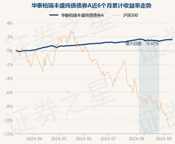 证券之星消息,9月11日,华泰柏瑞丰盛纯债债券A最新单位净值为1.1374元,累计净值为1.601元,较前一交易日上涨0.06%。历史数据显示该基金近1个月上涨0.1%,近3个月上涨0.65%,近6个月上涨1.64%,近1年上涨4.17%。该基金近6个月的累计收益率走势如下图: