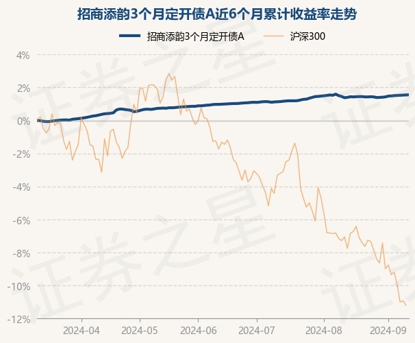 证券之星消息,9月11日,招商添韵3个月定开债A最新单位净值为1.0337元,累计净值为1.1417元,较前一交易日上涨0.01%。历史数据显示该基金近1个月上涨0.1%,近3个月上涨0.58%,近6个月上涨1.55%,近1年上涨3.31%。该基金近6个月的累计收益率走势如下图: