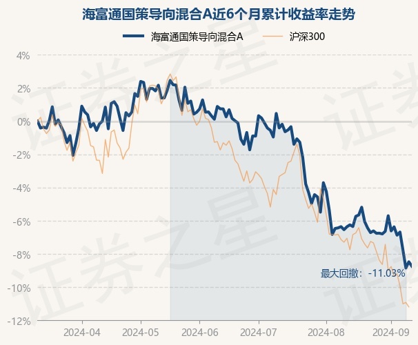 证券之星消息,9月11日,海富通国策导向混合A最新单位净值为1.5996元,累计净值为2.6387元,较前一交易日下跌0.29%。历史数据显示该基金近1个月下跌2.35%,近3个月下跌8.84%,近6个月下跌8.74%,近1年下跌10.64%。该基金近6个月的累计收益率走势如下图: