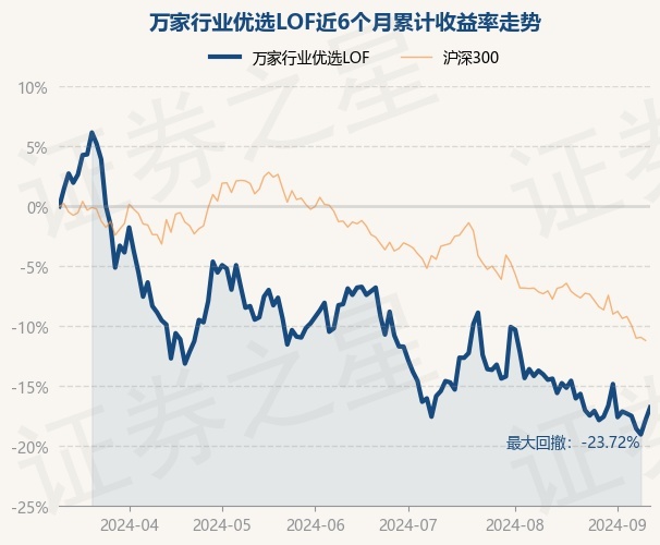 证券之星消息,9月11日,万家行业优选LOF最新单位净值为0.6693元,累计净值为3.7838元,较前一交易日上涨1.3%。历史数据显示该基金近1个月下跌3.2%,近3个月下跌9.28%,近6个月下跌16.76%,近1年下跌33.87%。该基金近6个月的累计收益率走势如下图:
