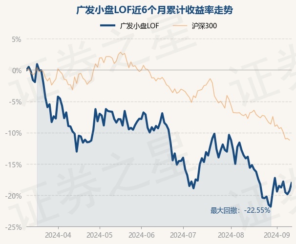 证券之星消息,9月11日,广发小盘LOF最新单位净值为1.102元,累计净值为4.4731元,较前一交易日上涨1.53%。历史数据显示该基金近1个月下跌5.12%,近3个月下跌9.8%,近6个月下跌18.04%,近1年下跌20.91%。该基金近6个月的累计收益率走势如下图: