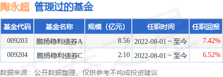 陶永超先生:中国国籍,杜克大学量化金融经济学专业理学硕士。现任鹏扬基金管理有限公司混合投资部可转债研究员。2022年8月1日起担任鹏扬稳利债券型证券投资基金基金经理。