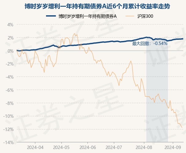 证券之星消息,9月12日,博时岁岁增利一年持有期债券A最新单位净值为1.2288元,累计净值为1.7393元,较前一交易日上涨0.02%。历史数据显示该基金近1个月上涨0.15%,近3个月上涨0.64%,近6个月上涨1.78%,近1年上涨4.45%。该基金近6个月的累计收益率走势如下图: