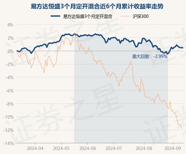 证券之星消息,9月12日,易方达恒盛3个月定开混合最新单位净值为1.0925元,累计净值为1.2805元,较前一交易日下跌0.06%。历史数据显示该基金近1个月下跌0.14%,近3个月下跌2.08%,近6个月上涨0.42%,近1年上涨3.53%。该基金近6个月的累计收益率走势如下图: