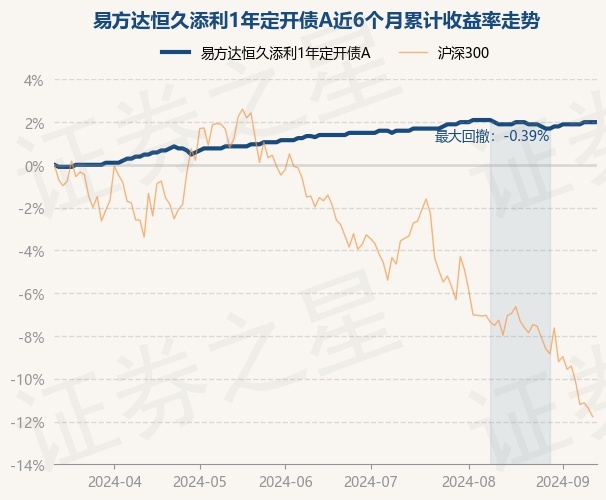 证券之星消息,9月12日,易方达恒久添利1年定开债A最新单位净值为1.02元,累计净值为1.479元,较前一交易日上涨0.0%。历史数据显示该基金近1个月上涨0.1%,近3个月上涨0.64%,近6个月上涨2.0%,近1年上涨5.13%。该基金近6个月的累计收益率走势如下图: