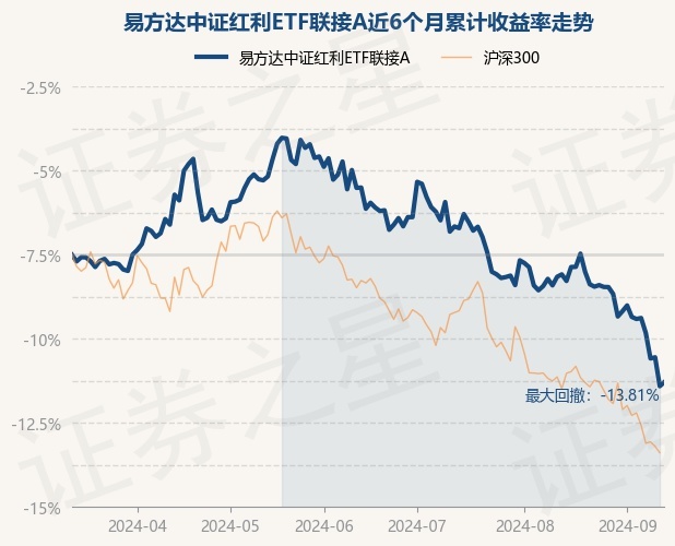 证券之星消息,9月12日,易方达中证红利ETF联接A最新单位净值为1.1154元,累计净值为1.2584元,较前一交易日上涨0.27%。历史数据显示该基金近1个月下跌6.34%,近3个月下跌12.0%,近6个月下跌7.57%,近1年下跌3.78%。该基金近6个月的累计收益率走势如下图: