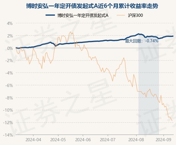 证券之星消息,9月12日,博时安弘一年定开债发起式A最新单位净值为1.1506元,累计净值为1.3102元,较前一交易日上涨0.03%。历史数据显示该基金近1个月上涨0.17%,近3个月上涨0.88%,近6个月上涨1.89%,近1年上涨4.58%。该基金近6个月的累计收益率走势如下图: