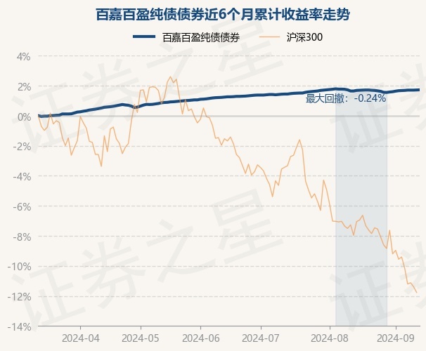证券之星消息,9月12日,百嘉百盈纯债债券最新单位净值为1.0504元,累计净值为1.0504元,较前一交易日上涨0.01%。历史数据显示该基金近1个月上涨0.08%,近3个月上涨0.51%,近6个月上涨1.72%,近1年上涨3.75%。该基金近6个月的累计收益率走势如下图: