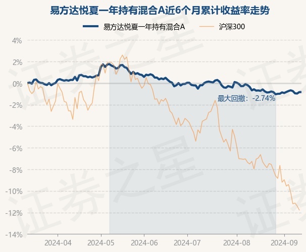 证券之星消息,9月12日,易方达悦夏一年持有混合A最新单位净值为1.0322元,累计净值为1.0322元,较前一交易日上涨0.0%。历史数据显示该基金近1个月下跌0.27%,近3个月下跌1.44%,近6个月下跌0.94%,近1年上涨0.05%。该基金近6个月的累计收益率走势如下图: