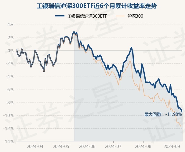 证券之星消息,9月12日,工银瑞信沪深300ETF最新单位净值为3.3305元,累计净值为0.9233元,较前一交易日下跌0.42%。历史数据显示该基金近1个月下跌4.34%,近3个月下跌8.6%,近6个月下跌9.45%,近1年下跌13.18%。该基金近6个月的累计收益率走势如下图:
