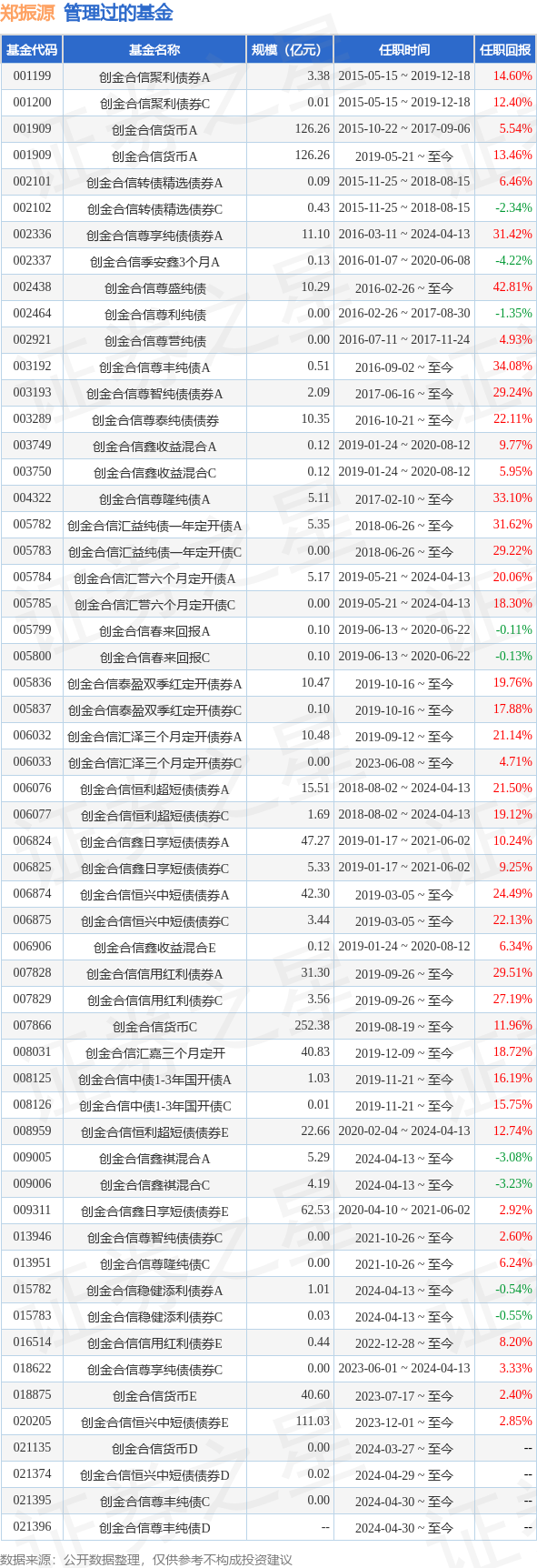 郑振源先生:中国国籍,中国人民银行研究生部经济学硕士。2009年7月加入第一创业证券股份有限公司,历任研究所宏观债券研究员、资产管理部宏观债券研究员、投资主办等职务,2014年8月加入创金合信基金管理有限公司,曾任创金合信货币市场基金基金经理(2015年10月22日至2017年9月6日),创金合信尊利纯债债券型证券投资基金基金经理(2016年2月26日至2017年8月29日),创金合信尊誉纯债债券型证券投资基金基金经理(2016年7月11日至2017年11月23日),创金合信鑫优选灵活配置混合型证券投资基金基金经理(2015年11月25日至2018年8月14日),创金合信聚利债券型证券投资基金基金经理(2015年5月15日-2019年12月18日),创金合信尊盈纯债债券型证券投资基金基金经理(2016年1月7日起2020年6月8日至任职),创金合信尊盛纯债债券型证券投资基金基金经理(2016年2月26日起任职),创金合信尊享纯债债券型证券投资基金基金经理(2016年3月11日起至2024年4月13日),现任固定收益总部投资主管,创金合信尊丰纯债债券型证券投资基金基金经理(2016年9月2日起任职),创金合信尊泰纯债债券型证券投资基金基金经理(2016年10月21日起任职),创金合信尊隆纯债债券型证券投资基金基金经理(2017年2月10日起任职),创金合信尊智纯债债券型证券投资基金基金经理(2017年6月16日起任职),创金合信汇益纯债一年定期开放债券型证券投资基金基金经理(2018年6月26日起任职),创金合信鑫日享短债债券型证券投资基金基金经理(2019年1月17日起至2021年6月2日),创金合信鑫收益灵活配置混合型证券投资基金基金经理(2019年1月24日起至2020年8月12日任职),创金合信恒兴中短债债券型证券投资基金基金经理(2019年3月5日起任职),创金合信货币市场基金基金经理(2019年5月21日起任职),创金合信春来回报一年期定期开放混合型发起式证券投资基金基金经理(2019年6月13日起至2020年6月22日任职),创金合信汇泽纯债三个月定期开放债券型证券投资基金基金经理(2019年9月12日起任职),创金合信信用红利债券型证券投资基金基金经理(2019年9月26日起任职)、创金合信中债1-3年国开行债券指数证券投资基金基金经理(2019年11月21日起任职)、创金合信汇嘉三个月定期开放债券型发起式证券投资基金基金经理(2019年12月9月起任)。曾任创金合信汇誉纯债六个月定期开放债券型证券投资基金基金经理(2019年05月21日至2024年04月13日)、创金合信恒利超短债债券型证券投资基金基金经理(2018年08月02日至2024年04月13日)。现任创金合信鑫祺混合型证券投资基金基金经理(2024年04月13日起任职)。2024年4月13日起担任创金合信稳健添利债券型证券投资基金基金经理。现任创金合信泰盈双季红6个月定期开放债券型证券投资基金基金经理(2019年10月16日起任职)。