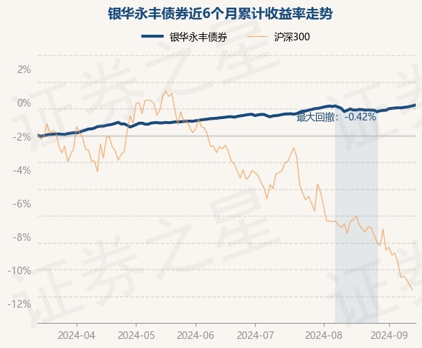 证券之星消息,9月13日,银华永丰债券最新单位净值为1.0447元,累计净值为1.0917元,较前一交易日上涨0.06%。历史数据显示该基金近1个月上涨0.38%,近3个月上涨0.98%,近6个月上涨2.28%,近1年上涨4.25%。该基金近6个月的累计收益率走势如下图: