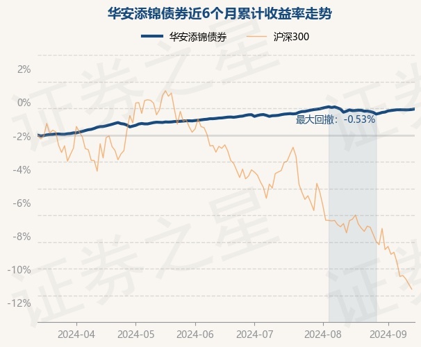 证券之星消息,9月13日,华安添锦债券最新单位净值为1.05元,累计净值为1.058元,较前一交易日上涨0.04%。历史数据显示该基金近1个月上涨0.16%,近3个月上涨0.7%,近6个月上涨1.96%,近1年上涨3.77%。该基金近6个月的累计收益率走势如下图: