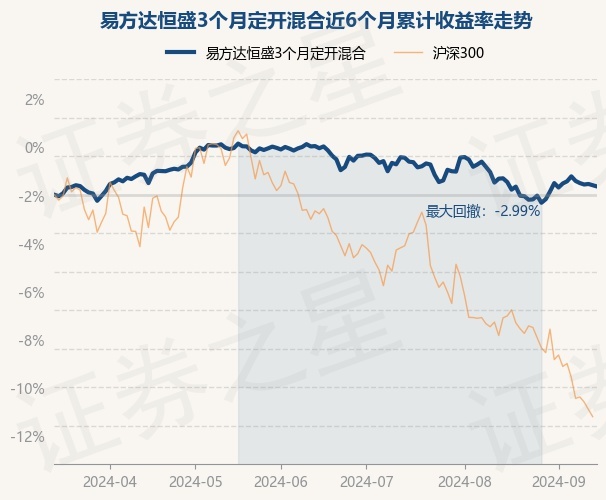 证券之星消息,9月13日,易方达恒盛3个月定开混合最新单位净值为1.0918元,累计净值为1.2798元,较前一交易日下跌0.06%。历史数据显示该基金近1个月下跌0.4%,近3个月下跌2.03%,近6个月上涨0.43%,近1年上涨3.65%。该基金近6个月的累计收益率走势如下图: