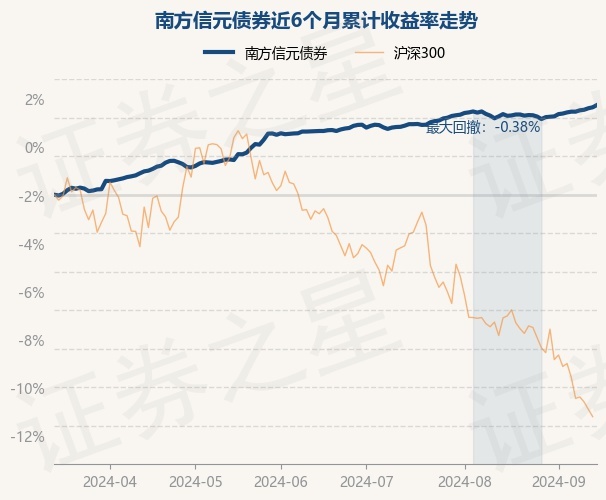 证券之星消息,9月13日,南方信元债券最新单位净值为1.0623元,累计净值为1.1085元,较前一交易日上涨0.11%。历史数据显示该基金近1个月上涨0.57%,近3个月上涨1.33%,近6个月上涨4.66%,近1年上涨6.72%。该基金近6个月的累计收益率走势如下图: