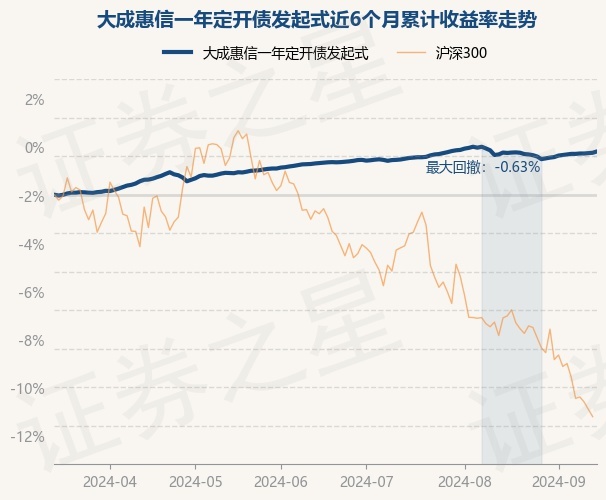 证券之星消息,9月13日,大成惠信一年定开债发起式最新单位净值为1.049元,累计净值为1.089元,较前一交易日上涨0.07%。历史数据显示该基金近1个月上涨0.15%,近3个月上涨0.64%,近6个月上涨2.25%,近1年上涨4.53%。该基金近6个月的累计收益率走势如下图: