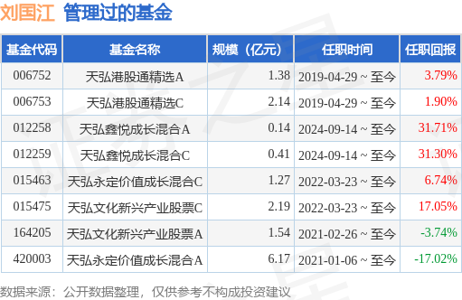 刘国江先生:华南理工大学企业管理硕士学位,任招商基金管理有限公司董事会办公室业务经理、研究员、高级研究员、基金经理助理;同德资产管理有限公司研究总监、投资经理;深圳桐德投资管理有限公司投资经理。2017年4月加盟天弘,现任基金经理。2021年1月6日担任天弘永定价值成长混合型证券投资基金基金经理。2021年2月26日任职天弘文化新兴产业股票型证券投资基金基金经理。