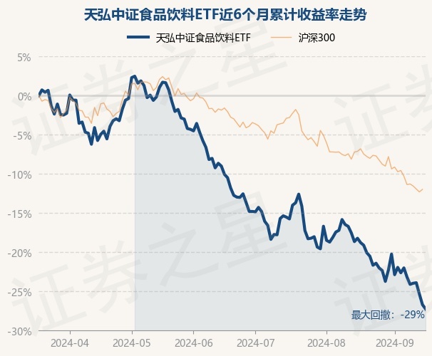 证券之星消息,9月18日,天弘中证食品饮料ETF最新单位净值为0.561元,累计净值为0.561元,较前一交易日下跌0.74%。历史数据显示该基金近1个月下跌10.43%,近3个月下跌19.11%,近6个月下跌27.24%,近1年下跌34.3%。该基金近6个月的累计收益率走势如下图:
