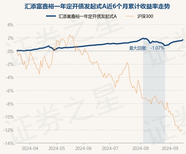 证券之星消息,9月18日,汇添富鑫裕一年定开债发起式A最新单位净值为1.0137元,累计净值为1.0637元,较前一交易日上涨0.13%。历史数据显示该基金近1个月上涨0.33%,近3个月上涨0.78%,近6个月上涨1.69%,近1年上涨3.45%。该基金近6个月的累计收益率走势如下图:
