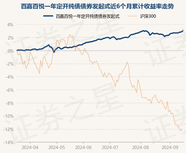 证券之星消息,9月18日,百嘉百悦一年定开纯债债券发起式最新单位净值为1.0455元,累计净值为1.0605元,较前一交易日上涨0.13%。历史数据显示该基金近1个月上涨0.45%,近3个月上涨1.43%,近6个月上涨3.02%,近1年上涨5.86%。该基金近6个月的累计收益率走势如下图:
