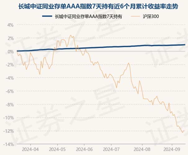 证券之星消息,9月18日,长城中证同业存单AAA指数7天持有最新单位净值为1.0403元,累计净值为1.0403元,较前一交易日上涨0.02%。历史数据显示该基金近1个月上涨0.12%,近3个月上涨0.42%,近6个月上涨0.97%,近1年上涨2.23%。该基金近6个月的累计收益率走势如下图: