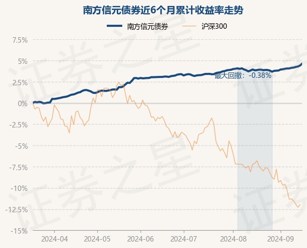 证券之星消息,9月18日,南方信元债券最新单位净值为1.0646元,累计净值为1.1108元,较前一交易日上涨0.22%。历史数据显示该基金近1个月上涨0.74%,近3个月上涨1.53%,近6个月上涨4.64%,近1年上涨7.01%。该基金近6个月的累计收益率走势如下图: