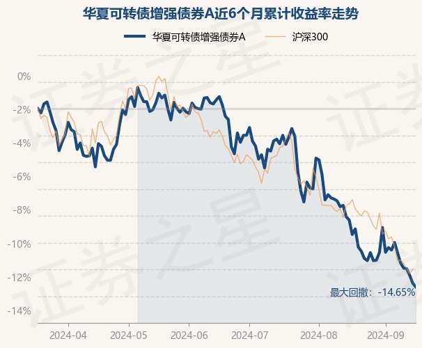 证券之星消息,9月18日,华夏可转债增强债券A最新单位净值为1.0426元,累计净值为1.0426元,较前一交易日下跌0.32%。历史数据显示该基金近1个月下跌4.31%,近3个月下跌14.07%,近6个月下跌13.29%,近1年下跌18.59%。该基金近6个月的累计收益率走势如下图: