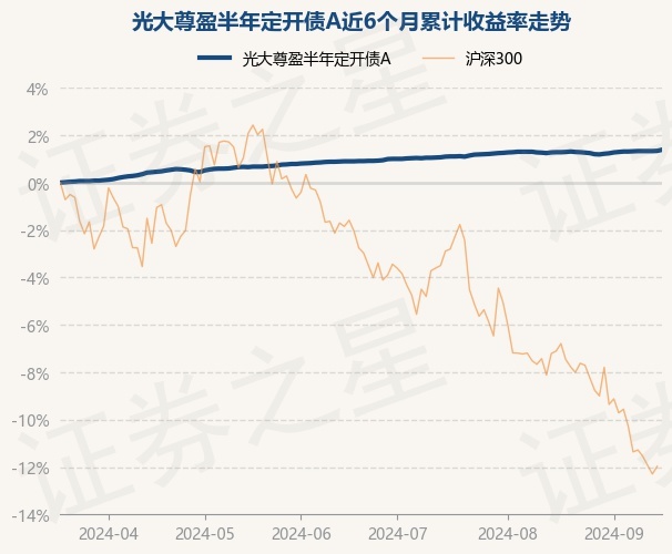 光大尊盈半年定开债A为债券型-混合一级基金,根据最新一期基金季报显示,该基金资产配置:无股票类资产,债券占净值比109.34%,现金占净值比0.54%。