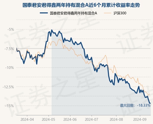 证券之星消息,9月18日,国泰君安君得鑫两年持有混合A最新单位净值为1.2464元,累计净值为2.4494元,较前一交易日下跌0.09%。历史数据显示该基金近1个月下跌5.79%,近3个月下跌15.73%,近6个月下跌14.41%,近1年下跌16.9%。该基金近6个月的累计收益率走势如下图: