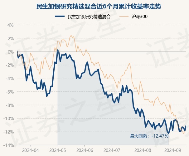 证券之星消息,9月18日,民生加银研究精选混合最新单位净值为0.832元,累计净值为1.146元,较前一交易日上涨0.85%。历史数据显示该基金近1个月上涨0.0%,近3个月下跌8.67%,近6个月下跌11.11%,近1年下跌25.45%。该基金近6个月的累计收益率走势如下图: