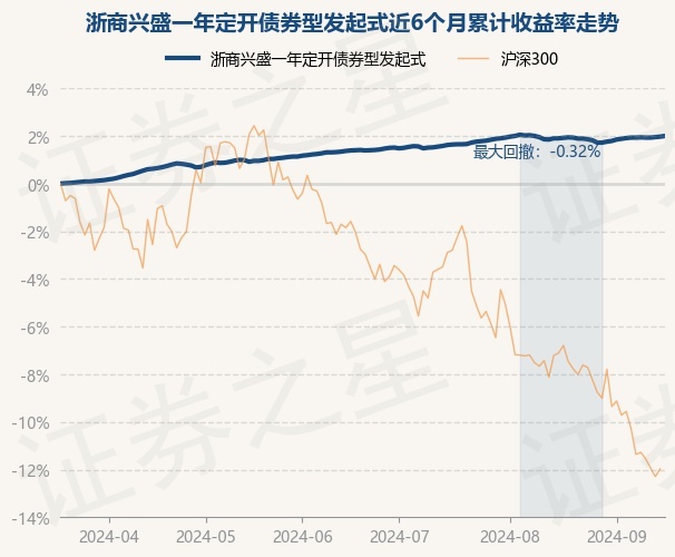 证券之星消息,9月18日,浙商兴盛一年定开债券型发起式最新单位净值为1.0201元,累计净值为1.1139元,较前一交易日上涨0.03%。历史数据显示该基金近1个月上涨0.08%,近3个月上涨1.94%,近6个月上涨2.0%,近1年上涨4.47%。该基金近6个月的累计收益率走势如下图: