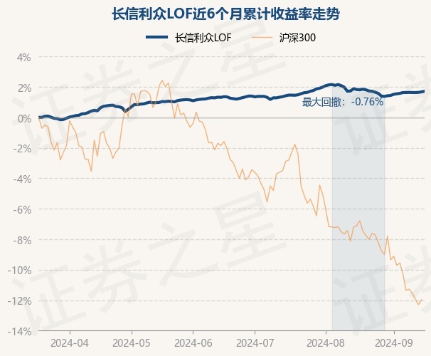 证券之星消息,9月18日,长信利众LOF最新单位净值为0.9673元,累计净值为1.3063元,较前一交易日上涨0.04%。历史数据显示该基金近1个月下跌0.09%,近3个月上涨0.35%,近6个月上涨1.71%,近1年上涨3.34%。该基金近6个月的累计收益率走势如下图: