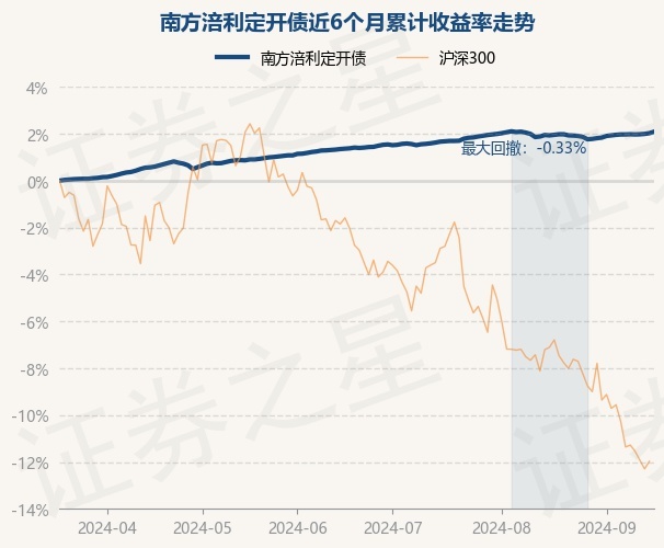 证券之星消息,9月18日,南方涪利定开债最新单位净值为1.2952元,累计净值为1.3302元,较前一交易日上涨0.06%。历史数据显示该基金近1个月上涨0.13%,近3个月上涨0.72%,近6个月上涨2.09%,近1年上涨4.51%。该基金近6个月的累计收益率走势如下图: