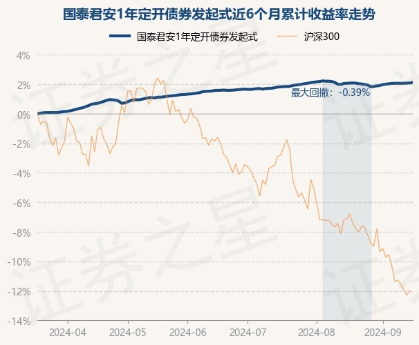 证券之星消息,9月18日,国泰君安1年定开债券发起式最新单位净值为1.0249元,累计净值为1.1143元,较前一交易日上涨0.04%。历史数据显示该基金近1个月上涨0.05%,近3个月上涨0.53%,近6个月上涨2.12%,近1年上涨4.81%。该基金近6个月的累计收益率走势如下图: