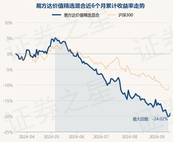 证券之星消息,9月19日,易方达价值精选混合最新单位净值为0.9384元,累计净值为3.6474元,较前一交易日上涨1.09%。历史数据显示该基金近1个月下跌5.35%,近3个月下跌15.64%,近6个月下跌19.1%,近1年下跌20.35%。该基金近6个月的累计收益率走势如下图: