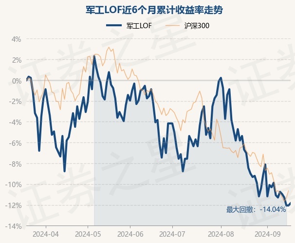 证券之星消息,9月19日,军工LOF最新单位净值为0.804元,累计净值为1.634元,较前一交易日上涨0.25%。历史数据显示该基金近1个月下跌5.19%,近3个月下跌9.76%,近6个月下跌11.84%,近1年下跌19.28%。该基金近6个月的累计收益率走势如下图: